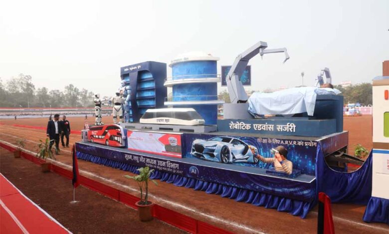 झांकी में आगे आधुनिक इलेक्ट्रिक परिवहन, रोबोटिक्स एवं ऑटोमेशन, मेगा इनक्यूबेशन/इनोवेशन सेंटर, हेल्थ-टेक, शिक्षा एवं कौशल विकास में एआर/वीआर तकनीक तथा स्टार्टअप्स की विकास यात्रा को IDEA → PROTOTYPE → GTM (Go-To-Market) → SCALE चरणों के माध्यम से प्रभावी रूप से प्रदर्शित किया गया। अंतिम दृश्य में आधुनिक बुलेट ट्रेन के माध्यम से तेज, सतत एवं भविष्य उन्मुख औद्योगिक विकास का प्रतीकात्मक चित्रण किया गया।