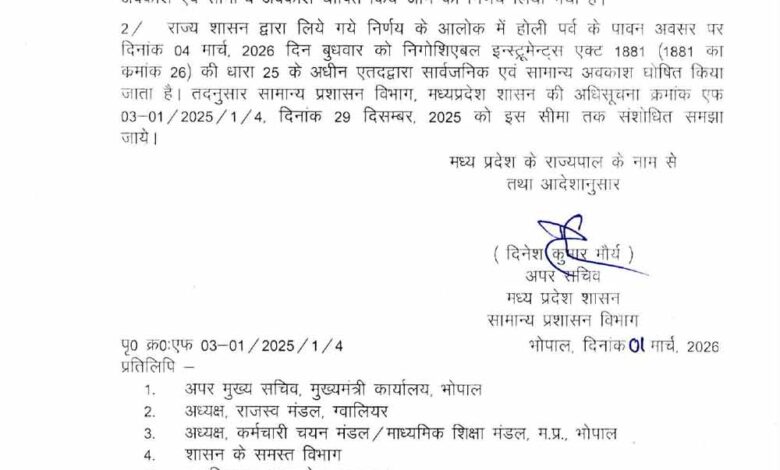 मध्य प्रदेश शासन ने होली के पावन अवसर पर प्रदेशवासियों और सरकारी कर्मचारियों के लिए बड़ी घोषणा की है। राज्य सरकार ने पहले से घोषित अवकाश में संशोधन करते हुए अब 4 मार्च 2026 (बुधवार) को भी सार्वजनिक एवं सामान्य अवकाश घोषित कर दिया है।