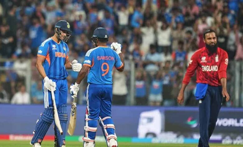 टी20 विश्व कप 2026 के दूसरे सेमीफाइनल में इंग्लैंड ने टॉस जीतकर पहले गेंदबाजी करने का फैसला किया है। वानखेड़े स्टेडियम में भारत ने पहले बल्लेबाजी करते हुए दूसरे ओवर में सलामी बल्लेबाज अभिषेक शर्मा का विकेट गंवाया। अभिषेक 7 गेंद में 9 रन ही बना सके। विल जैक्स ने उन्हें कैच आउट करवाया। संजू सैमसन को तीसरे ओवर में जीवनदान मिला। पावरप्ले में भारत ने एक विकेट खोकर 67 रन बनाए। संजू सैमसन ने 26 गेंद में अर्धशतक लगाया है। ईशान किशन 10वें ओवर में 18 गेंद में 39 रन बनाकर आदिल रशीद का शिकार बने। सलामी बल्लेबाज संजू सैमसन 42 गेंद में 8 चौके और सात छक्के की मदद से 89 रन बनाकर पवेलियन लौटे। कप्तान सूर्यकुमार यादव ने 6 गेंद में 11 रन बनाए। शिवम दुबे 43 के स्कोर पर रन आउट हुए। तिलक वर्मा 7 गेंद में 21 रन की तूफानी पारी खेलकर आउट हुए।