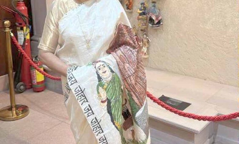 ​शपथ ग्रहण समारोह के दौरान सांसद लक्ष्मी वर्मा ने एक विशेष रूप से डिज़ाइन की गई साड़ी धारण की थी, जिसने संसद भवन में सभी का ध्यान आकर्षित किया। यह परिधान पूर्णतः छत्तीसगढ़ की कला, संस्कृति और धरोहर का प्रतिनिधित्व कर रहा था। साड़ी के मुख्य भाग पर प्रदेश के ऐतिहासिक और पुरातात्विक गौरव ‘भोरमदेव मंदिर’ की सुंदर आकृति और प्रदेशवासियों की अगाध आस्था की प्रतीक ‘छत्तीसगढ़ महतारी’ का भव्य चित्र उकेरा गया था। इसके अतिरिक्त साड़ी की किनारी (बॉर्डर/लेयर) पर पारंपरिक छत्तीसगढ़ी अभिवादन ‘जय जोहार’ स्पष्ट अक्षरों में लिखा हुआ था, जो प्रदेश की सादगी, आत्मीयता और भाईचारे का सशक्त संदेश दे रहा था।