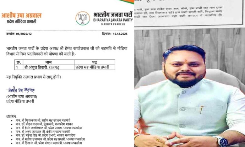 MP बीजेपी में बड़ी नियुक्ति: अंशुल तिवारी बने प्रदेश सह मीडिया प्रभारी