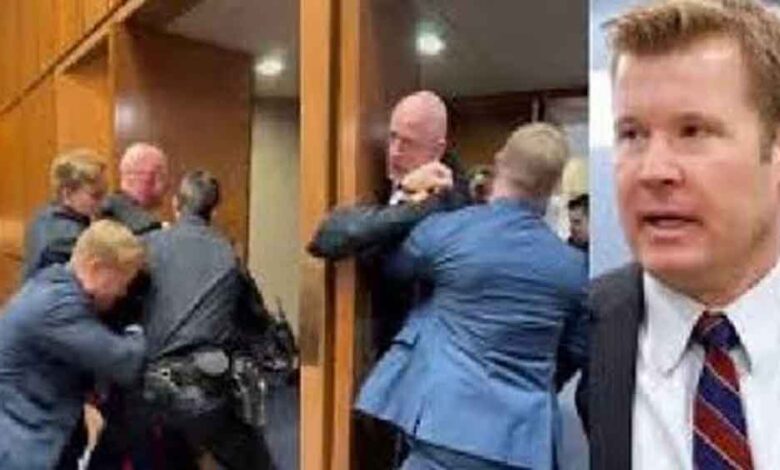 वायरल वीडियो में देखा जा सकता है कि पुलिस अधिकारियों के साथ अमेरिकी सांसद टिम शीही भी प्रदर्शनकारी पूर्व सैनिक को बाहर निकालने में मदद करते नजर आ रहे हैं। जब झड़प चल रही थी, तब कमरे में मौजूद लोगों की आवाजें सुनाई दे रही हैं। लोग कह रहे हैं, "उसका हाथ… उसका हाथ… ओह माय गॉड!” दूसरी तरफ, पुलिस अधिकारी बार-बार प्रदर्शनकारी से दरवाजा छोड़ने के लिए कहते हुए सुनाई देते हैं। इसी दौरान पूर्व मरीन मैकगिनेस का हाथ टूट जाता है।