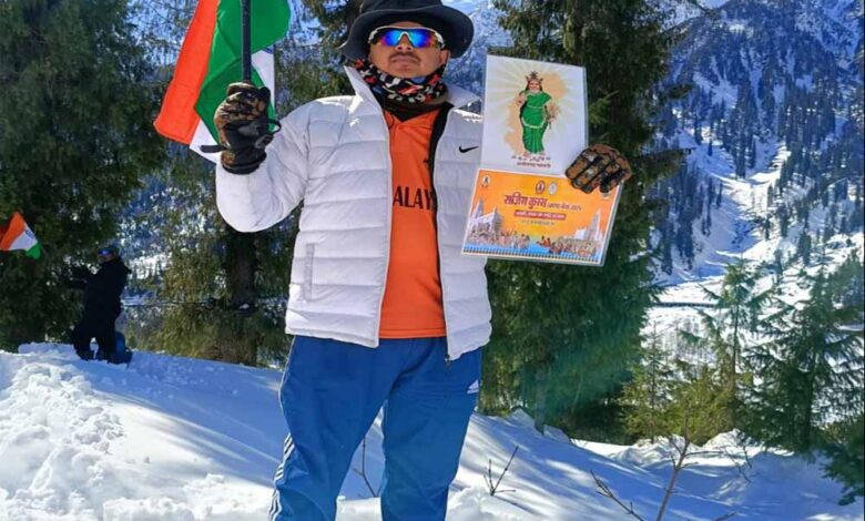 पर्वतारोहण एवं ट्रैकिंग के क्षेत्र में सक्रिय ग्राम पोंड़, जिला गरियाबंद के युवा खेमराज साहू ने हिमाचल प्रदेश की बर्फीली वादियों में राजिम कुंभ कल्प मेला 2026 का प्रचार कर जिले एवं प्रदेश का गौरव बढ़ाया है। उन्होंने कुल्लू जिले की सोलंग वैली से पतालसू पीक ट्रैक के दौरान लगभग 9000 फीट की ऊंचाई पर माइनस 6 डिग्री तापमान में तिरंगा एवं छत्तीसगढ़ महतारी की छायाप्रति के साथ मेले का संदेश प्रदर्शित किया।