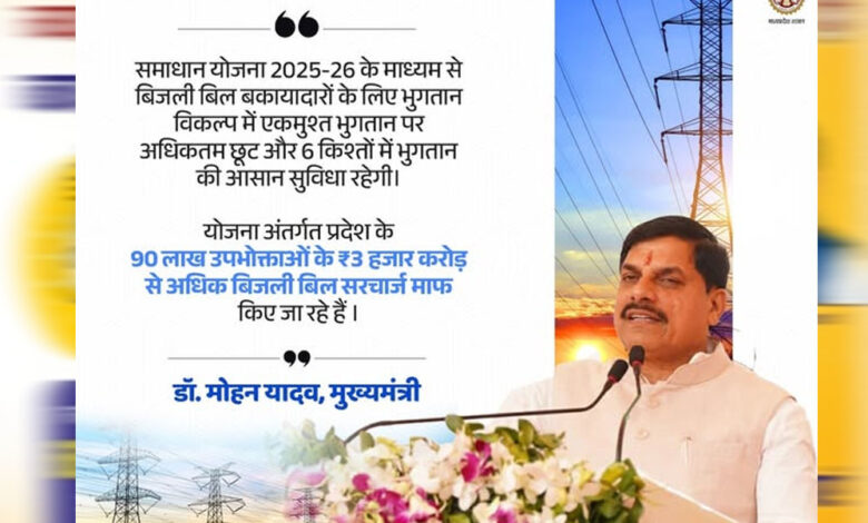 समाधान योजना 2025-26 का उद्देश्य 3 माह से अधिक अवधि के उपभोक्ताओं को बकाया विलंबित भुगतान के सरचार्ज पर छूट प्रदान करना है। यह योजना जल्दी आएं, एकमुश्त भुगतान कर ज्यादा लाभ पाएं के सिद्धांत पर आधारित है। इस योजना में उपभोक्ता को प्रथम चरण में एकमुश्त भुगतान करने पर सबसे अधिक लाभ हो रहा है जबकि द्वितीय चरण के दौरान छूट का प्रतिशत क्रमशः कुछ कम हो जाएगा। यह योजना दो चरणों में प्रारंभ होकर प्रथम चरण की शुरुआत 3 नवंबर 2025 से हुई जो कि 31 जनवरी 2026 तक चलेगी। इसमें बकाया बिल एकमुश्त जमा करने पर 60 से लेकर 100 प्रतिशत तक सरचार्ज माफ किया जा रहा। इसके बाद द्वितीय और अंतिम चरण शुरू होगा जो कि 01 फरवरी से 28 फरवरी 2026 तक चलेगा। दूसरे चरण में 50 से 90 फ़ीसदी तक सरचार्ज माफ किया जाएगा। समाधान योजना 2025-26 का लाभ उठाने के लिए उपभोक्ताओं को कंपनी के ऐप एवं कॉमन सर्विस सेंटर (सीएससी) तथा एमपी ऑनलाइन पर भी पंजीयन की सुविधा उपलब्ध है। पंजीयन के दौरान अलग-अलग उपभोक्ता श्रेणी के लिए पंजीयन राशि निर्धारित की गई है। घरेलू एवं कृषि उपभोक्ता कुल बकाया राशि का 10 प्रतिशत तथा गैर घरेलू और औद्योगिक उपभोक्ता कुल बकाया राशि का 25 प्रतिशत भुगतान कर पंजीयन कराकर योजना में शामिल होकर लाभ उठा सकते हैं। विस्तृत विवरण तीनों कंपनियों की वेबसाइटों पर भी देखा जा सकता है। साथ ही विद्युत वितरण केंद्र में पहुंचकर भी योजना के संबंध में जानकारी ले सकते हैं।